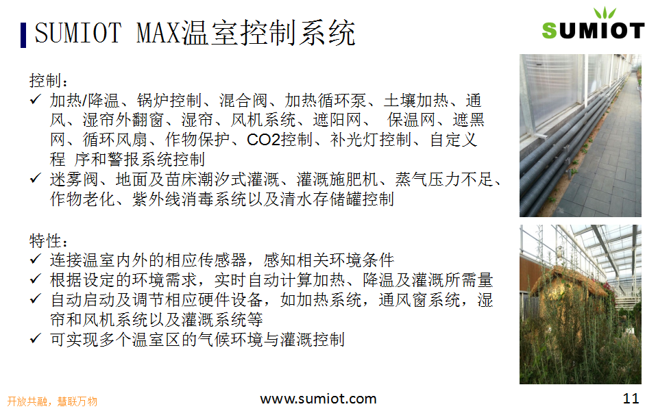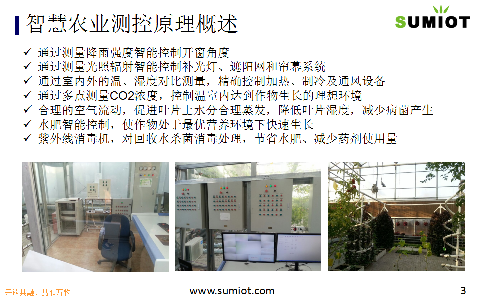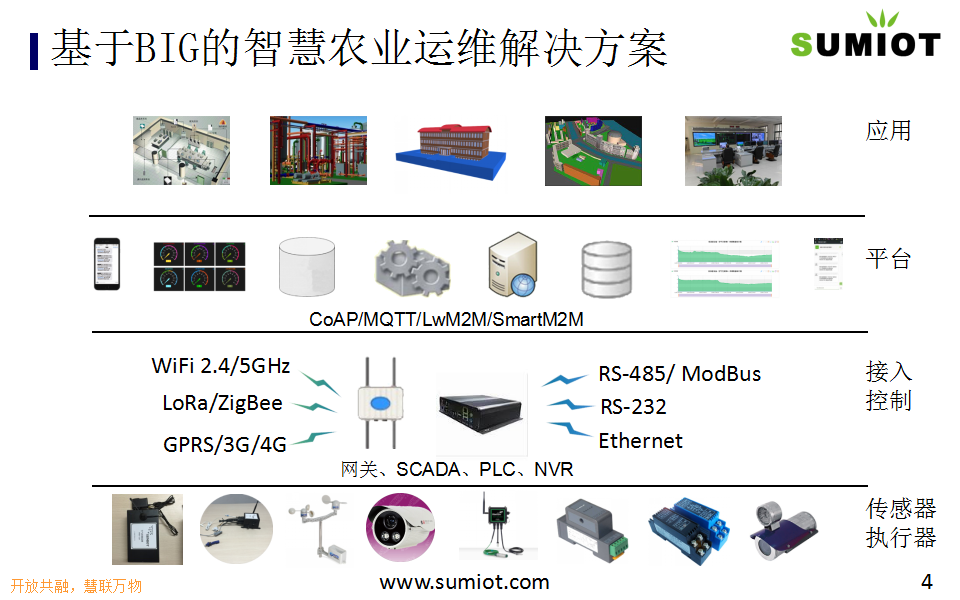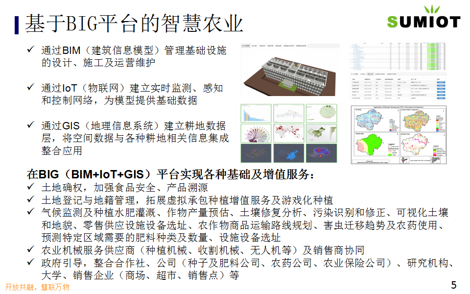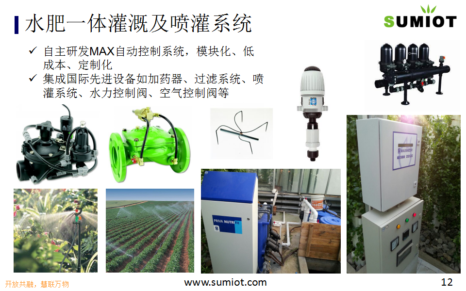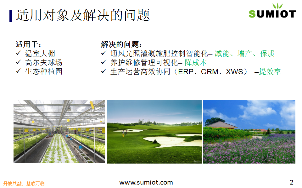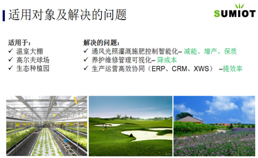 SUMIOT智慧农业解决方案,适用于温室大棚、高尔夫球场、生态种植园。基于自主研发的BIG平台,实现通风光照灌溉施肥控制智能化,养护维修管理可视化、生产运营高效协同,减能、增产、保质、降成本、提效率。