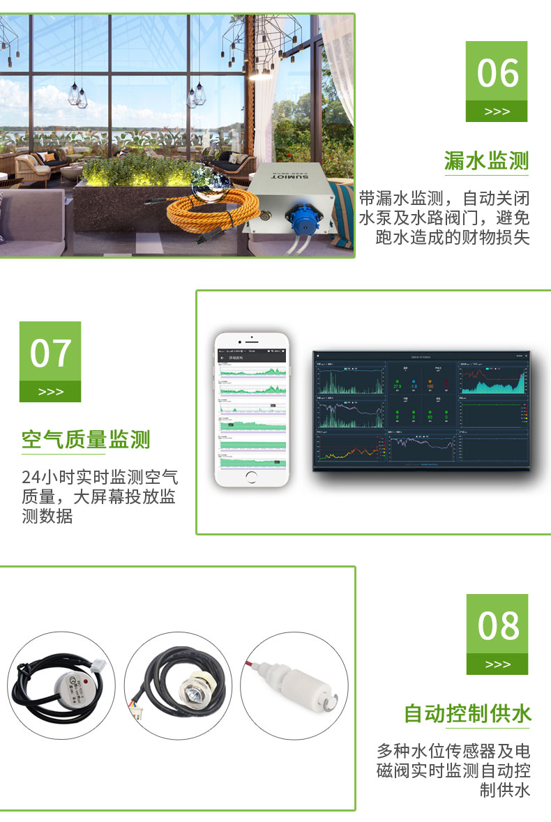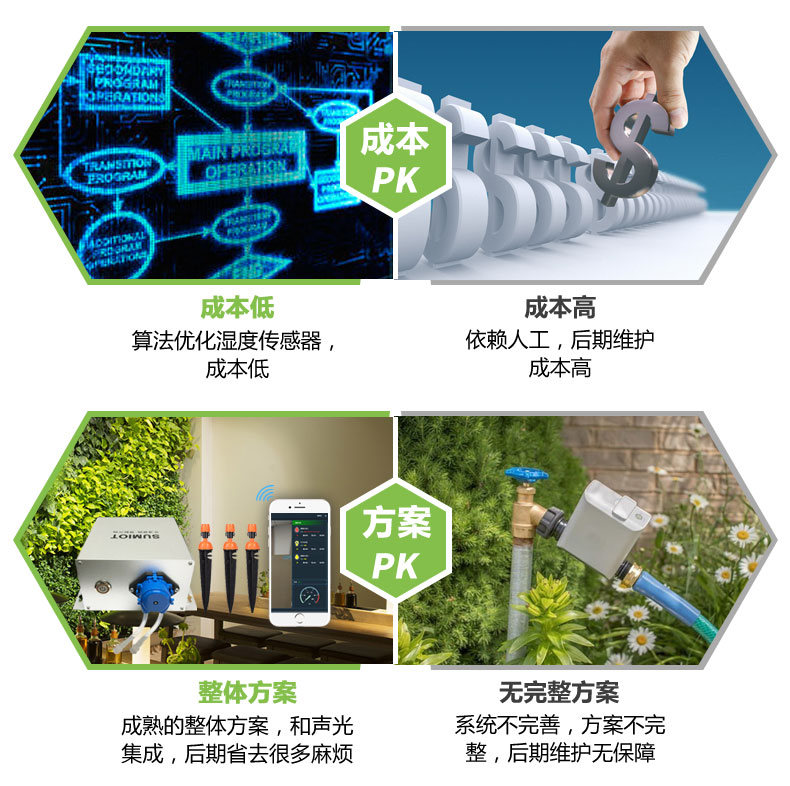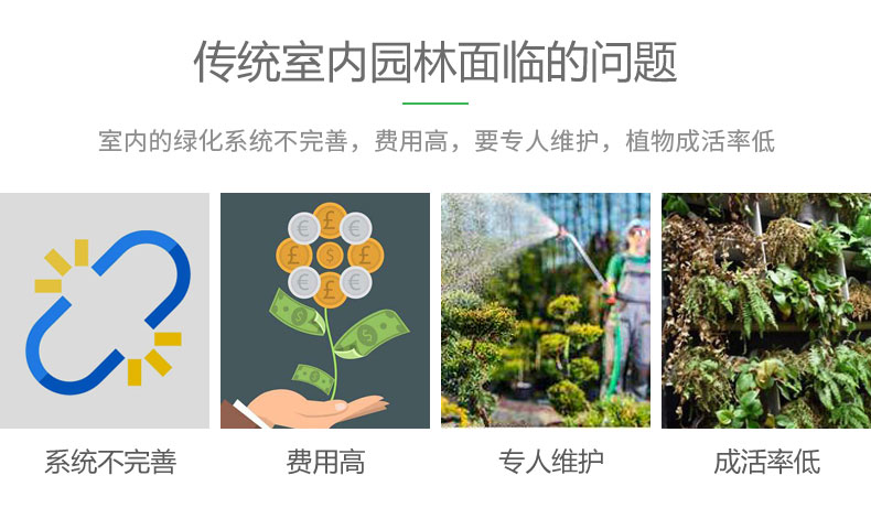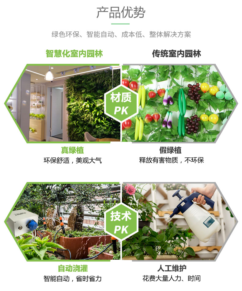 低成本打造舒适、生态、人文空间;室内空气质量较恶劣的地方主要集中于大型购物中心和办公总部大厦,污浊的空气会危害人们的健康;智慧化室内园林解决养护难题,无需专家参与,节省水电、人力、肥料,精准施肥、灌溉。